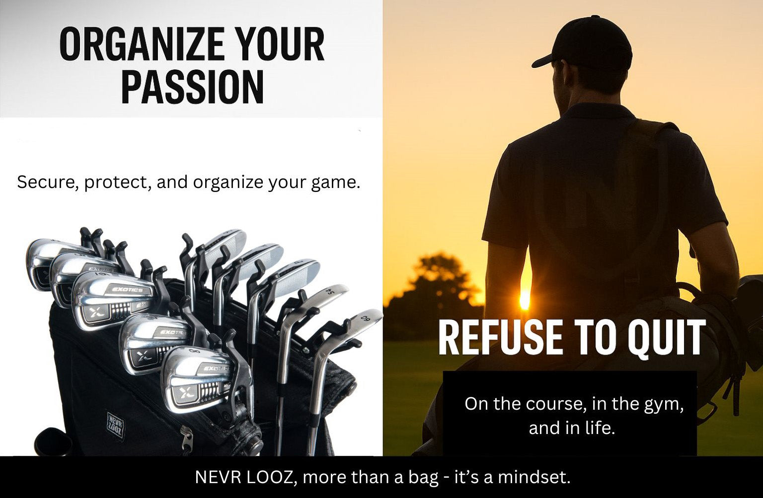 NEVR LOOZ bag features a precision-engineered internal frame, patented CLUBCLIP system to lock in your clubs, and a patented interchangeable EXOSKIN outer cover for a whole new look in seconds.